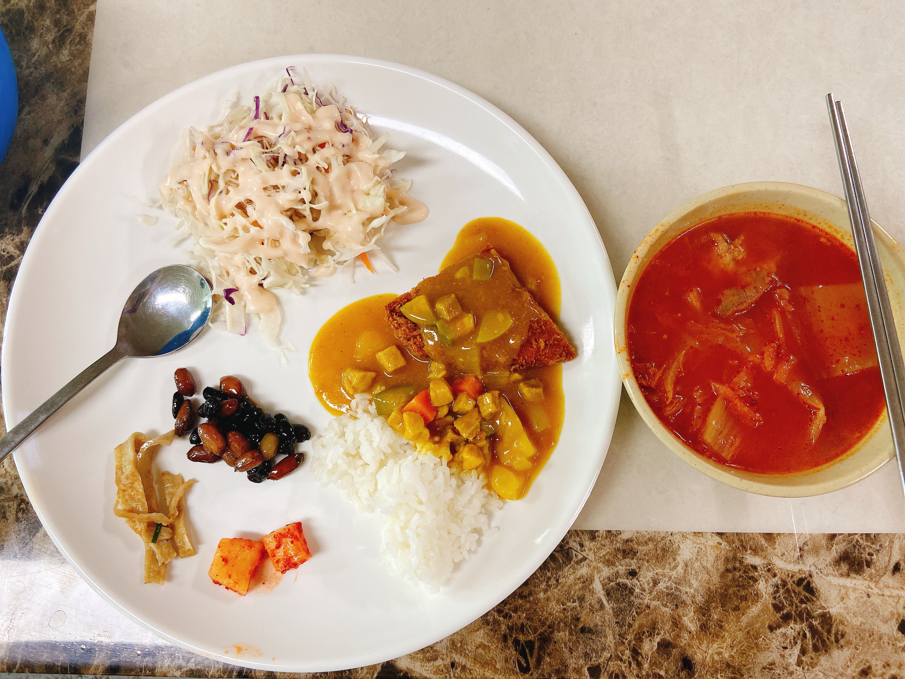 땅콩섞인 콩장/양배추샐러드/어묵볶음/깍두기 두개/